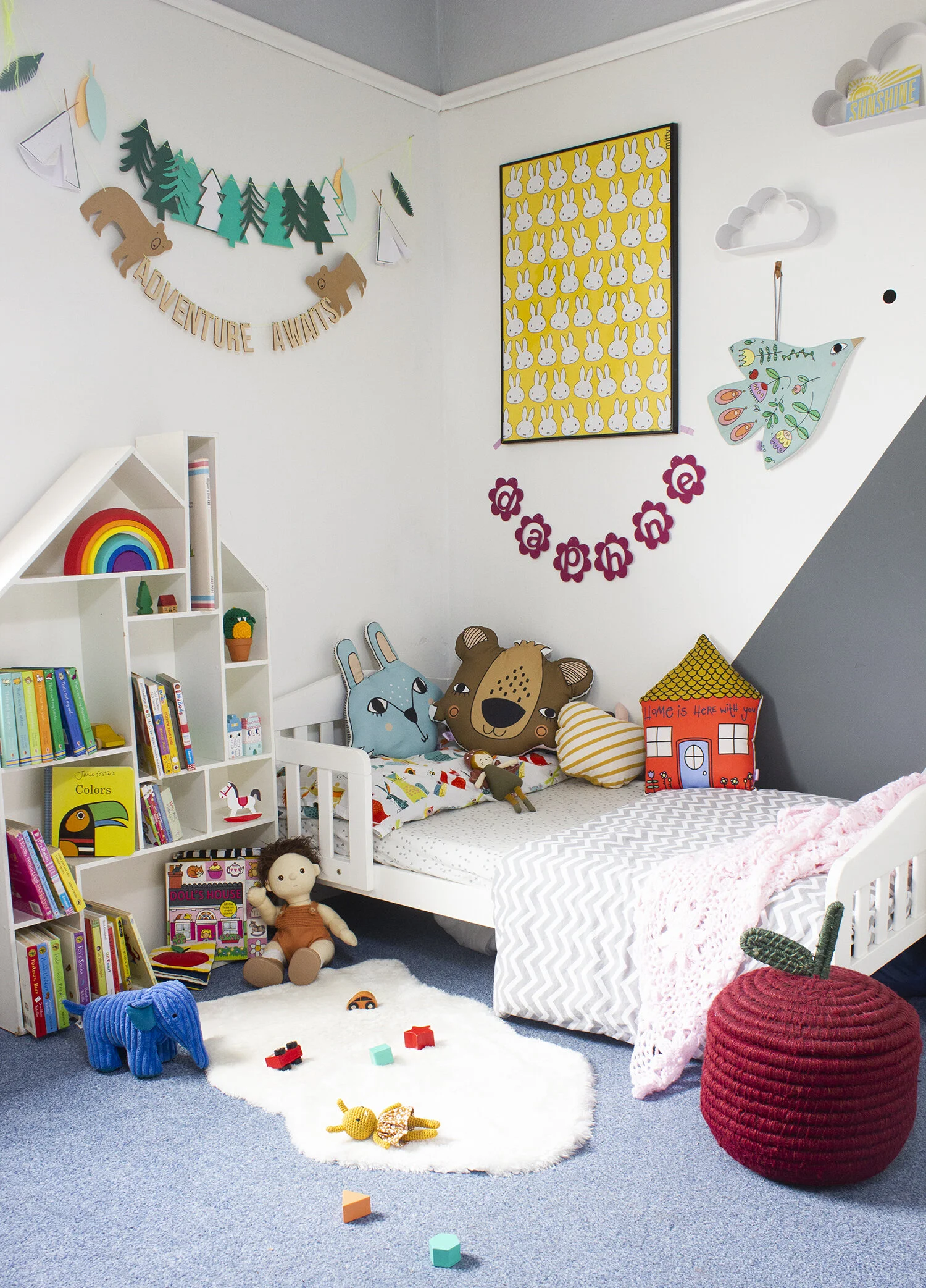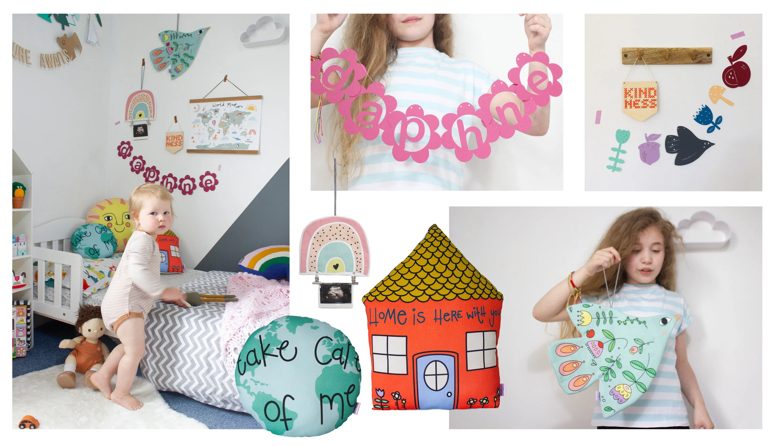 Personalised name garlands stamp their mark on their space and the rainbow photo hanger can be used to style old baby photos, a family shot or even a postcard sent from a loved one far away. I also wanted to encourage a little home learning with this stylish alphabet print.