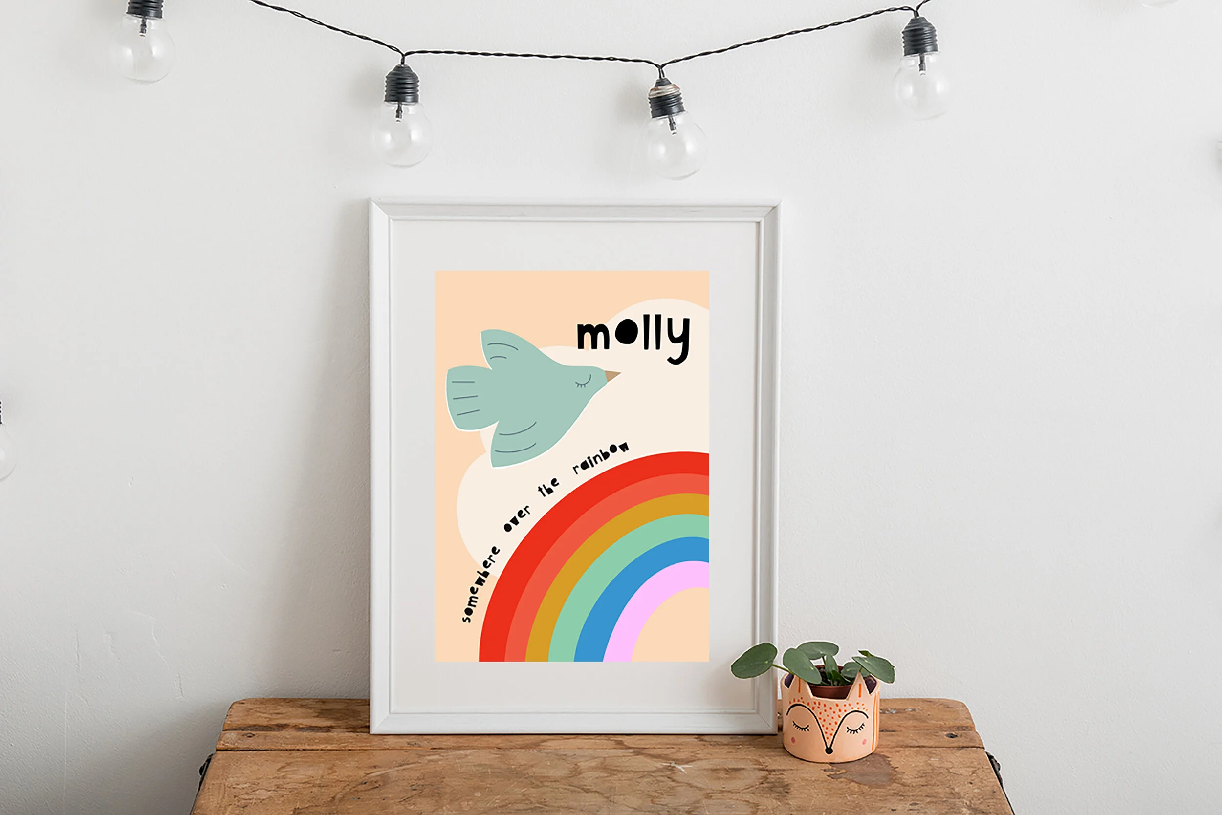 A dreamy bird flying over the rainbow. Perfect for a little girl’s bedroom or nursery or anyone that loves a good rainbow!